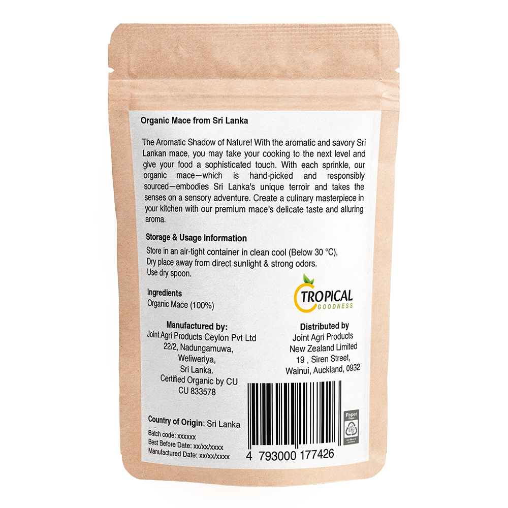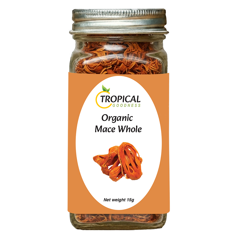 From the Tropical Goodness, you can enjoy the premium organic mace, the outer layer of the nutmeg seed. Our mace is available in both whole and ground forms. The ground mace is especially convenient for immediate use in your recipes. With its warm, mildly spicy flavour and subtle nutmeg notes, mace enhances both sweet and savoury dishes perfectly.